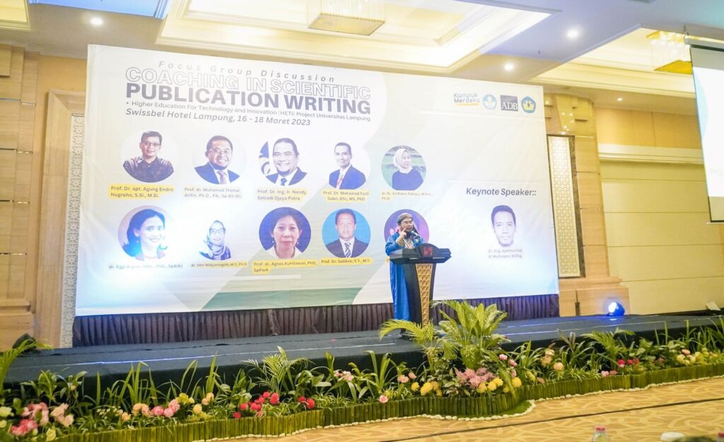 Pada tanggal 16 s.d 18 Maret 2023, HETI Project PIU Universitas Lampung kembali menyelenggarakan workshop penulisan publikasi ilmiah sebagai bagian dari kegiatan capacity development bertempat di Swiss Bellhotel, Bandar Lampung. Acara dibuka oleh Rektor Universitas Lampung yang diwakili oleh Wakil Rektor bidang Umum dan Keuangan, Rudy, S.H., LL.,M., LL.D.. Dalam sambutannya,  menyampaikan pentingnya publikasi ilmiah untuk dilakukan oleh para peneliti pada jurnal-jurnal bereputasi internasional untuk diseminasi hasil penelitian secara luas. Dengan mengetengahkan sebelas narasumber yaitu Prof. Dr. apr. Agung Endro Nugroho, S.Si., M.Si., Prof. dr. Muhamad Thohar Arifin, Ph.D., PA., Sp.BS (K), Prof. Dr. Ing. Ir. Nandy Setiadi Djaya Putra, Prof. Dr., Mohamad Fazli Sabri, BSc., MS, Ph.D., dr. Rr. Sri Ratna Rahayu, M.Kes., dr. Eggi Arguni, MSc., Ph.D., SpA(K)., dr. Vitri Widyaningsih, M.S., Ph.D., Prof. dr. Agnes Kurniawan, Ph.D., SpPark., Prof. Dr. Sutikno, S.T., M.T., Dr. Lilik Wahyudi, S.E., M.Si., dan Keynote Speaker Dr. Eng. Sjaikhurrizal El Muttaqien, M.Eng. yang telah banyak menerbitkan publikasi pada jurnal-jurnal internasional bereputasi tinggi,