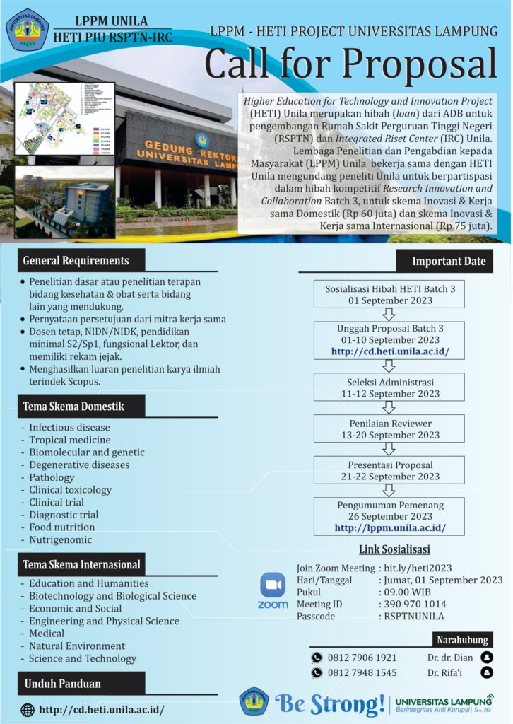 Sehubungan dengan dibukanya Program Riset Inovasi dan Kolaborasi skema domestik dan intemasional pada HETI project batch 3 Tahun 2023, maka bersama ini kami memohon bantuan Bapak/ Ibu Dekan dapat menginformasikan kepada para dosen dilingkungan fakultas Bapak/ Ibu pimpin untuk mengikuti kegiatan tersebut, yang akan dilaksanakan melalui zoom meeting pada: