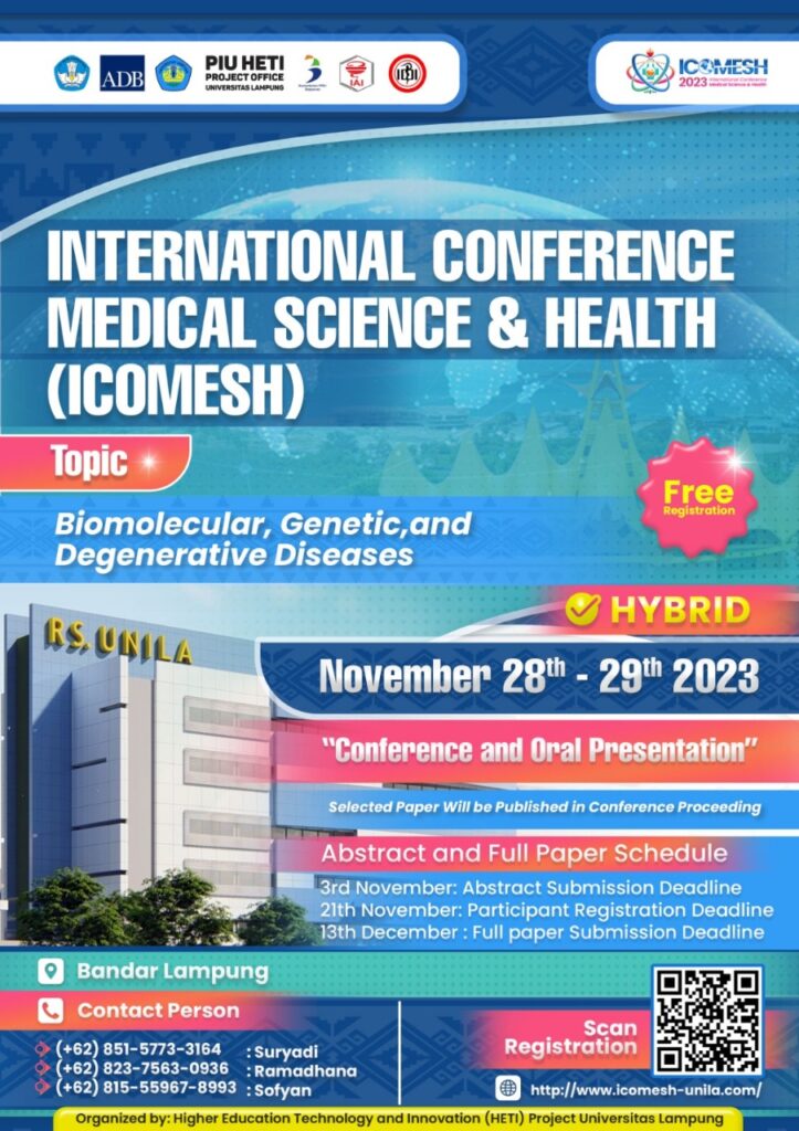 PIU Heti Project UNILA will announce the activities of the International Conference on Medical Science and Health (ICOMESH) through the “icomesh-unila.com” website in September 2023. Participants will register directly on the ICOMESH website and upload all the required documents.