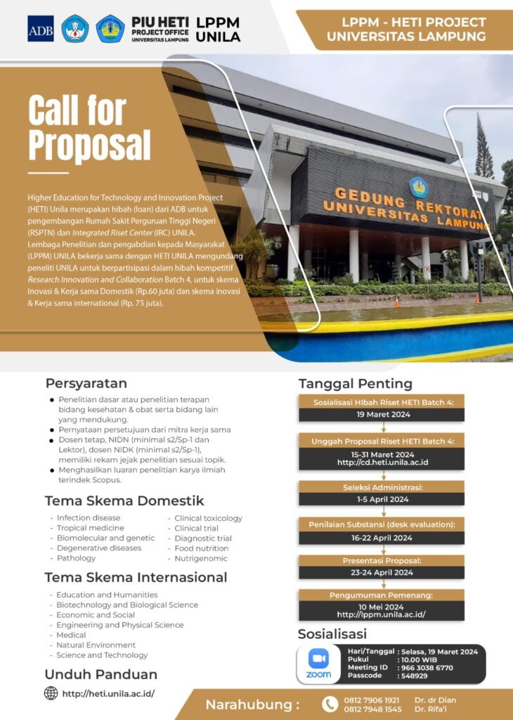 Sehubungan dengan dibukanya Program Riset Inovasi dan Kolaborasi skema domestik dan intemasional pada HETI project batch 4 Tahun 2024, maka bersama ini kami memohon bantuan Bapak/ Ibu Dekan dapat menginformasikan kepada para dosen di lingkungan fakultas Bapak/ Ibu pimpin untuk mengikuti kegiatan tersebut, yang akan dilaksanakan melalui zoom  meeting pada: